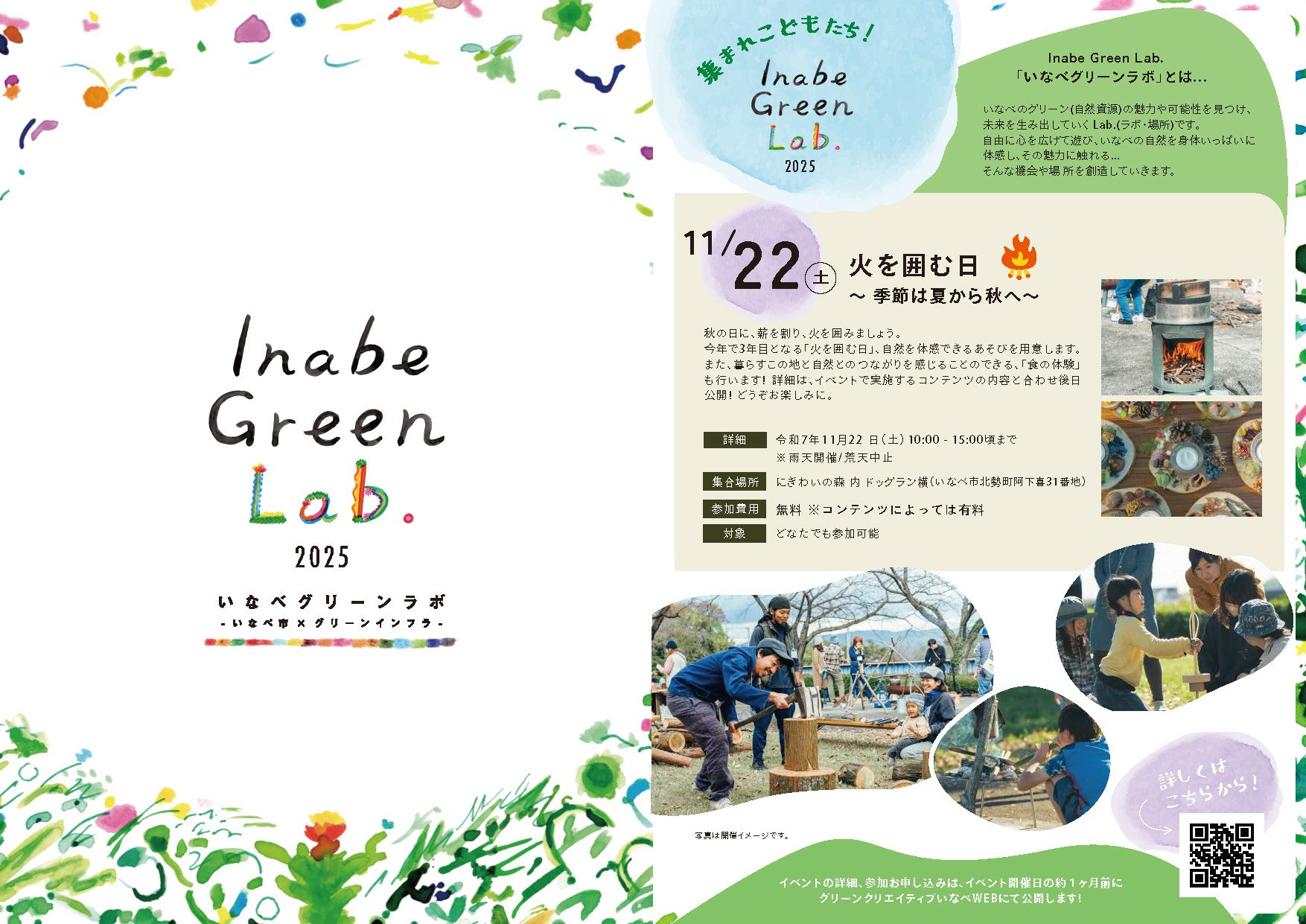 今年で3年⽬となる、Inabe Green Lab.『⽕を囲む⽇』、今回は「にぎわいの森」にて開催します!