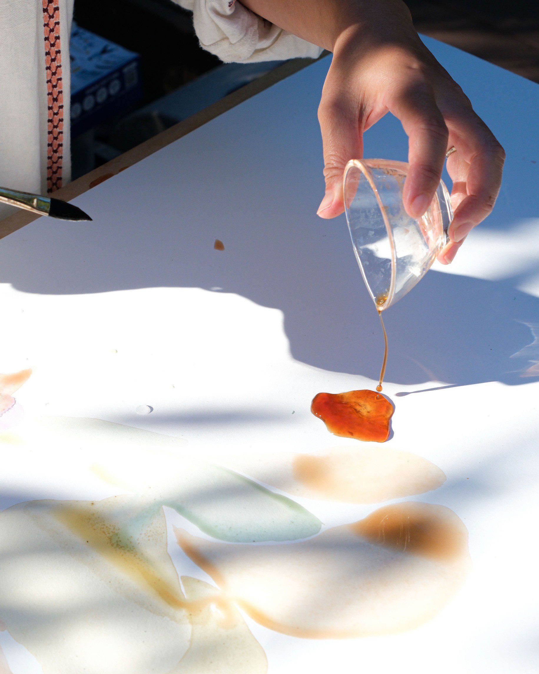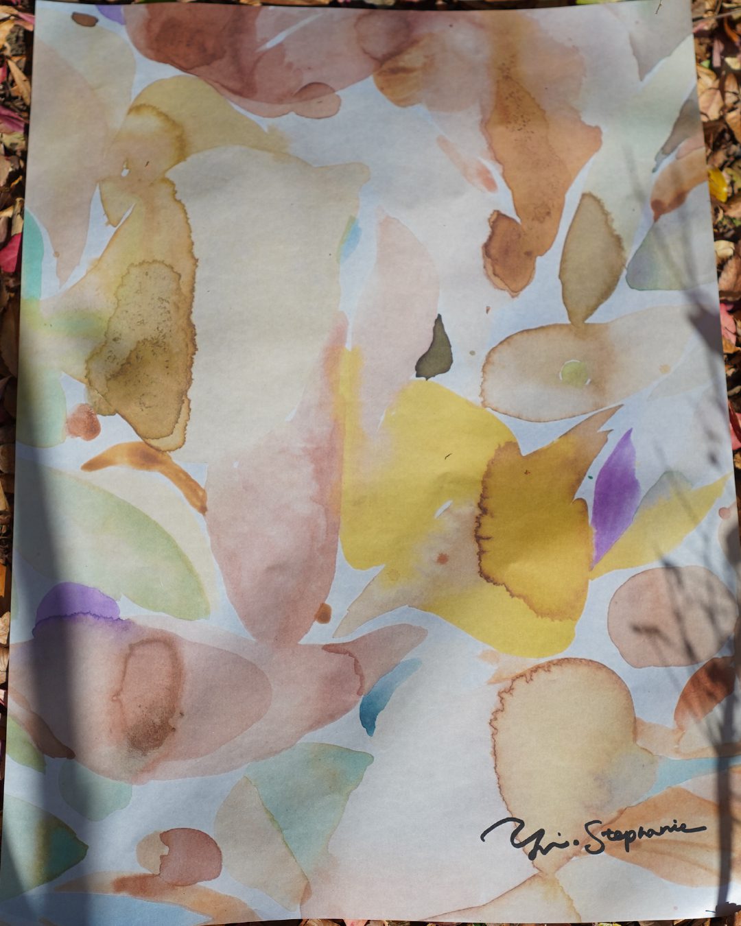 今秋…ユイ・ステファニーさんが『にぎわいの森』内にて制作された作品は、いなべ市内で採取した植物(葛、クチナシ、栗皮、くさぎなど)や石、土などを中心に自然の色のみで描かれています。