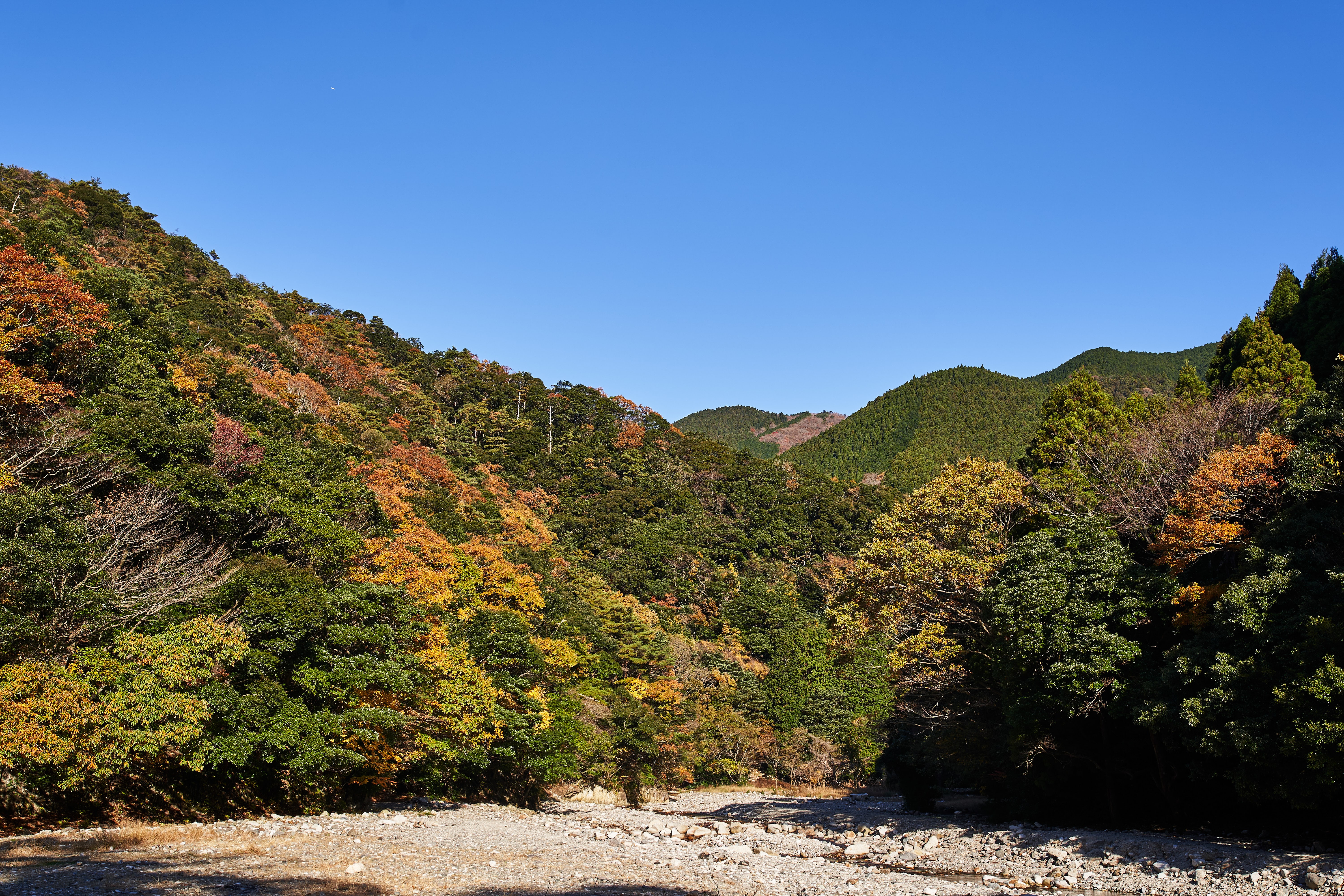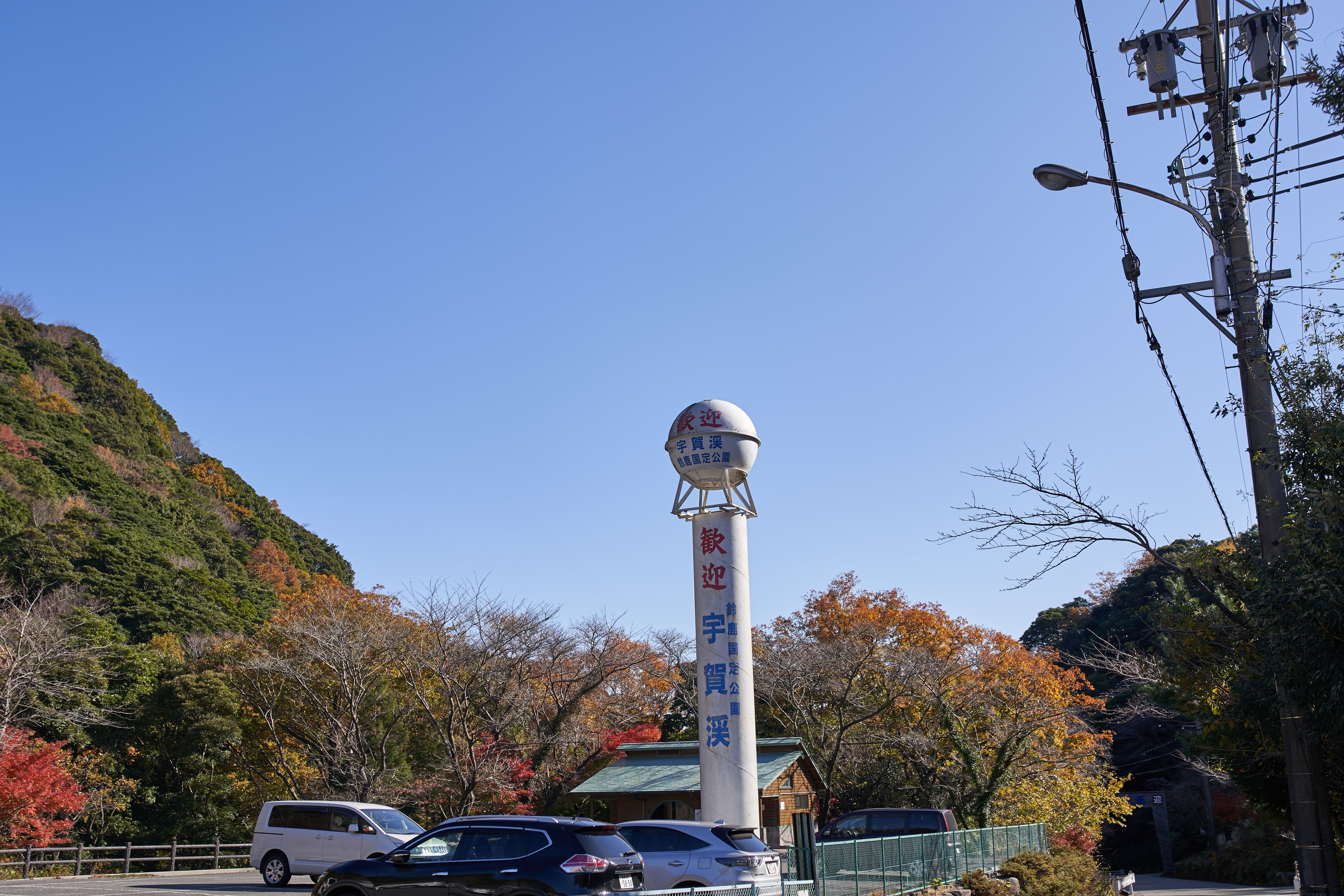11月下旬、宇賀渓はまさに紅葉の見頃。観光案内所に車をとめて少し歩くだけで、赤や黄に彩られた木々が目に飛び込む。